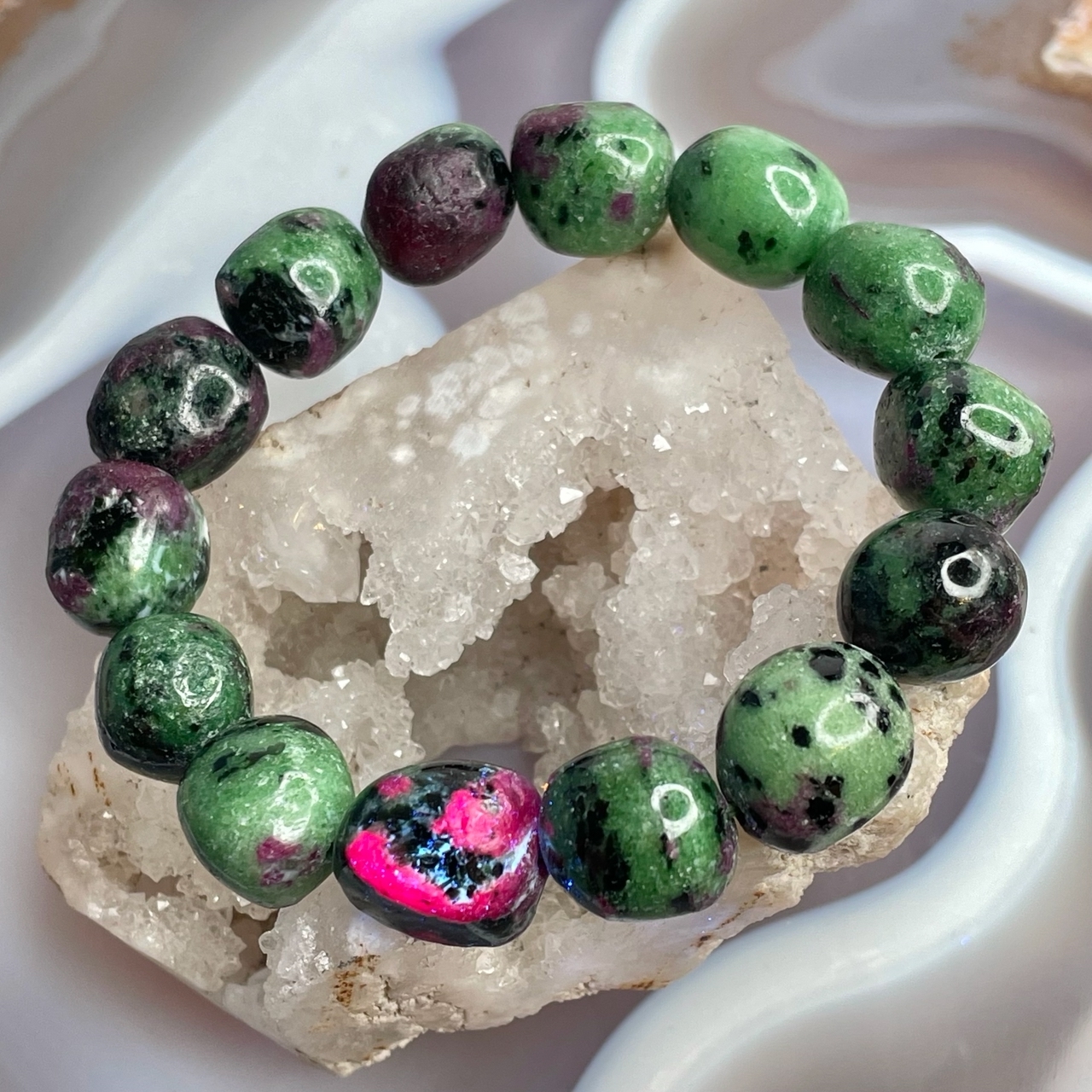 55949  Рубин Цоизит Браслет галтовка 13-16мм (Заряжено на Удачу)